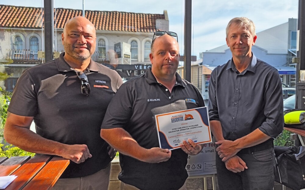 Cable Price representative Donal Campbell (left) and CCNZ Auckland Branch Chair Matthew Findlay (right) announced Cameron Mabey (centre) as Auckland’s top excavator operator at a prize-giving ceremony last night.